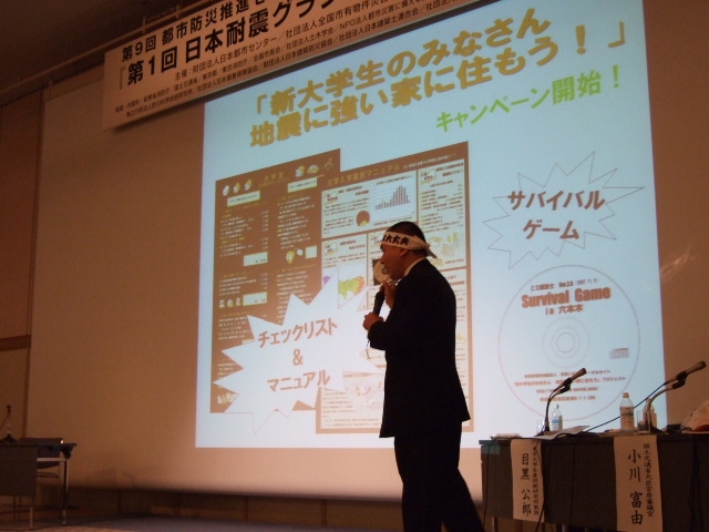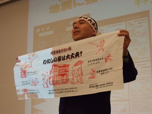 「新大学生のみなさん、地震に強い家に住もう」キャンペーンの提案と、ツール(1.耐震手ぬぐい「耐震補強手伝い隊」2.「大学生のためのチェックリスト&大学入学直前マニュアル」3.「Survival Game in六本木」)の使い方説明をしました。