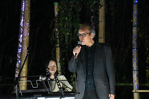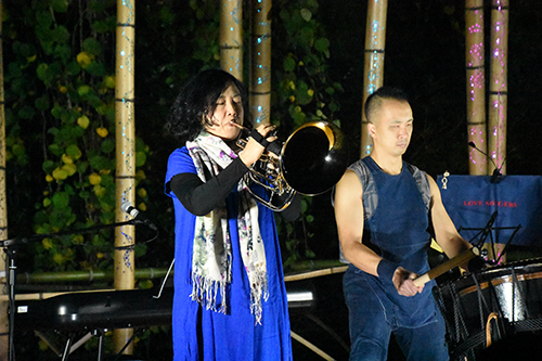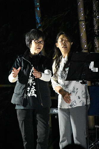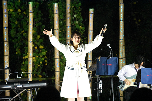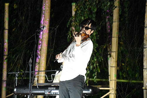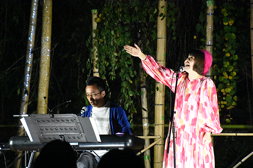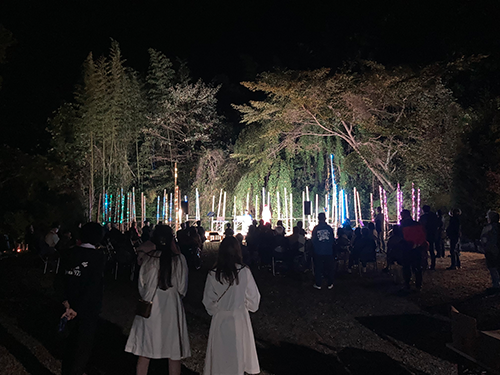 14日夕刻、「鎮魂と希望の竹明かり&音楽神社祭」会場を100本の竹明かりが照らし、「神秘のライブスポット=音楽神社」のこけら落としを行いました。